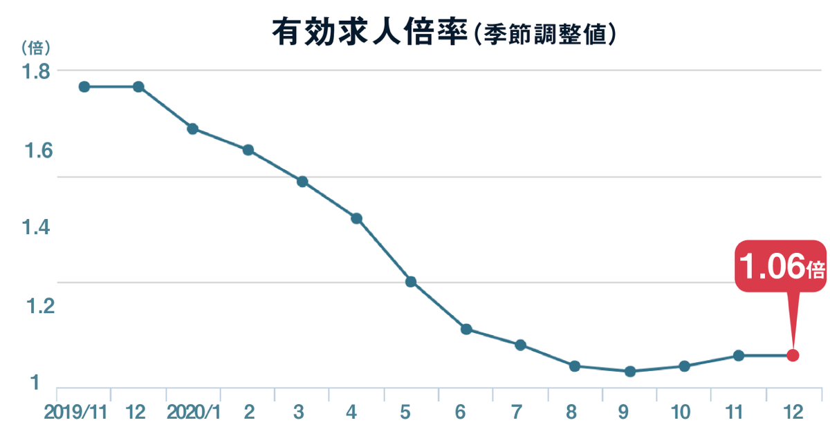 12月の有効求人倍率は1.06倍、令和2年の平均有効求人倍率は12年ぶりに減少