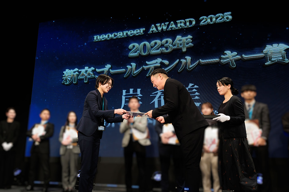 この社員総会内で行われた表彰式で「新卒入社ルーキー賞」と「新卒入社ゴールデンルーキー賞」の2冠に輝いたのが、2023年にネオキャリアへ入社した岸希美さん。