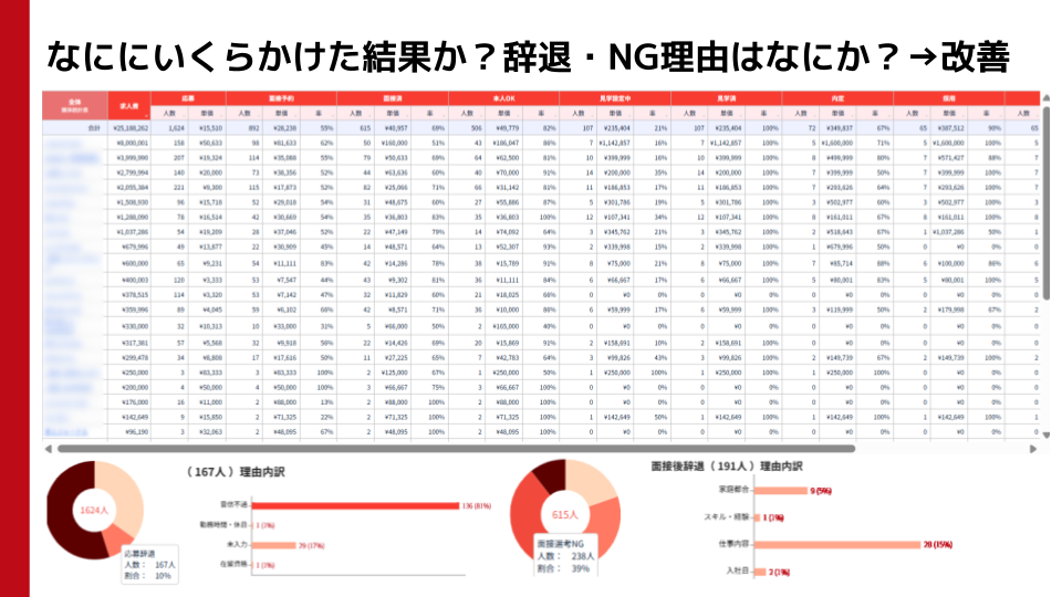 まずは、求職者辞退の具体的な理由を数値で把握しましょう。たとえば、ある案件での辞退理由は「時給が低いから」が○%、「勤務時間が合わないから」が○%……、というデータを採用支援会社に共有できれば、改善に繋がる打ち手も見えやすくなります。