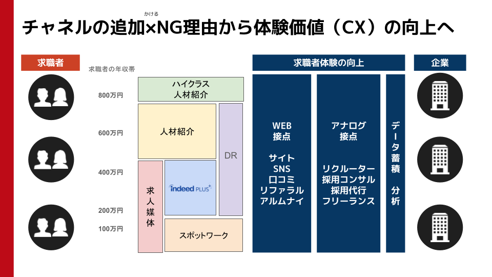 今後の採用は、Webによるオンラインチャネルをどんどん使いこなしながら、求職者から集めた「NG理由」のデータを集めつつ、オフライン施策も絡めて求職者の体験価値(CX)向上につなげていくアクションが必要になるでしょう。