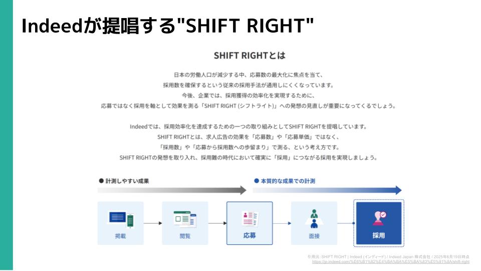 Indeedが近年提唱している「SHIFT RIGHT(シフトライト)」とは、これまでのように「応募数」を成果の指標にするのではなく、よりプロセスの後半、つまり「採用数」を基準に採用施策の効果を見ていこう、という考え方です。