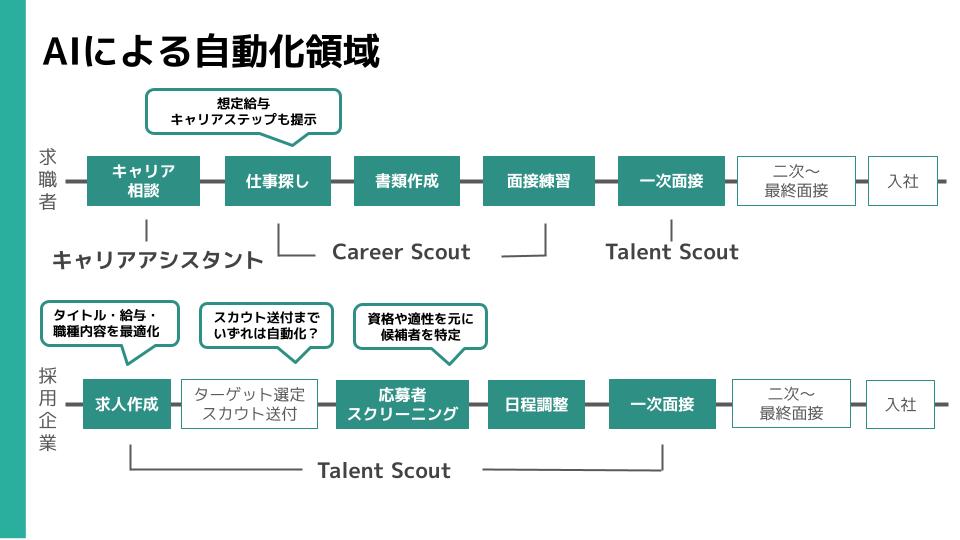 求職者向けの「Career Scout」では、求人紹介やキャリアステップの提示、書類作成や模擬面接までAIがサポートすると説明されています。今まで人材紹介のCA(キャリアアドバイザー)がやっていたことを、AIがやってくれるということですね。
