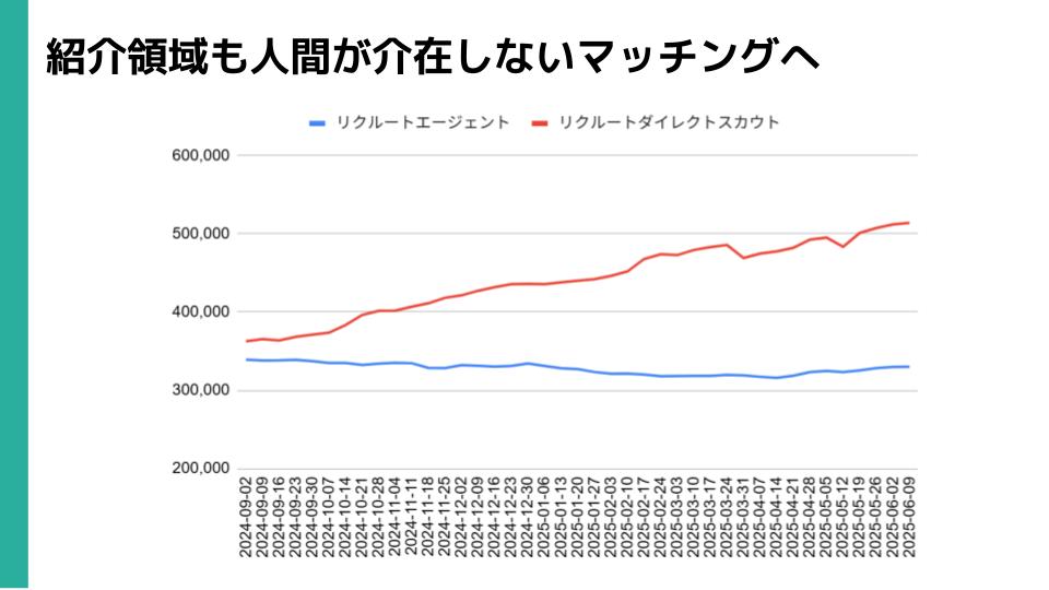 続いて、フロッグの収集した求人データを用いて、リクルート系列の各サービスの求人数を見てみましょう。リクルートエージェント(人材紹介)の求人数は減少傾向にある一方、リクルートダイレクトスカウト(スカウトサービス)はここ1年で10万件以上増えています。