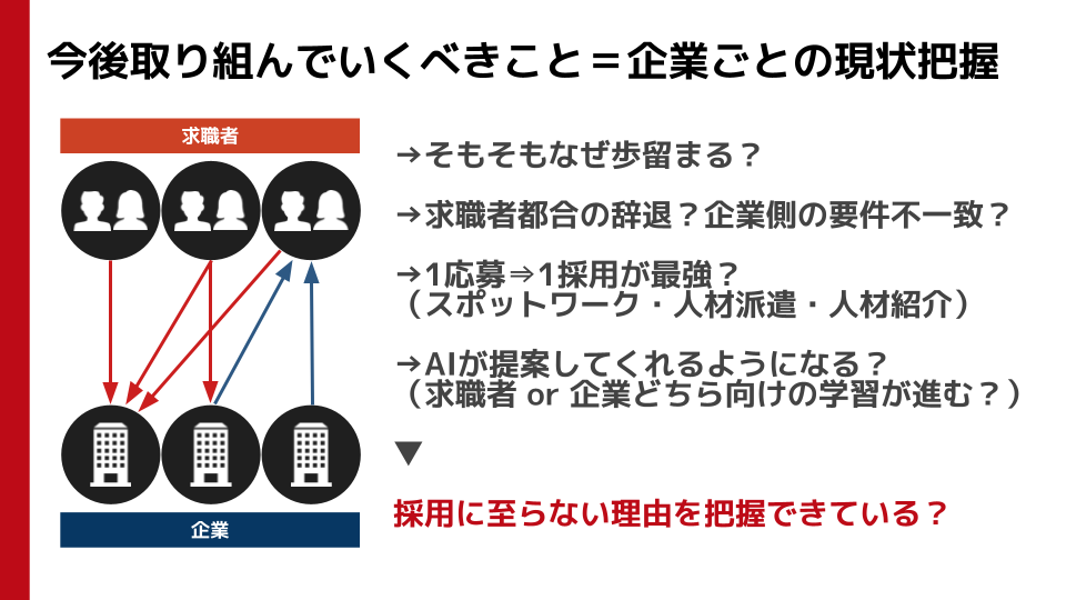 そのためにやるべきなのは、派遣先企業ごとに「なぜ採用に至らなかったのか」、しっかりと現状を把握すること。「歩留まりが悪い」といっても、求職者側の都合なのか、派遣先企業側の要件によるものなのか、原因をまずは二つの軸で分解するだけでも、状況は見えやすくなるはずです。
