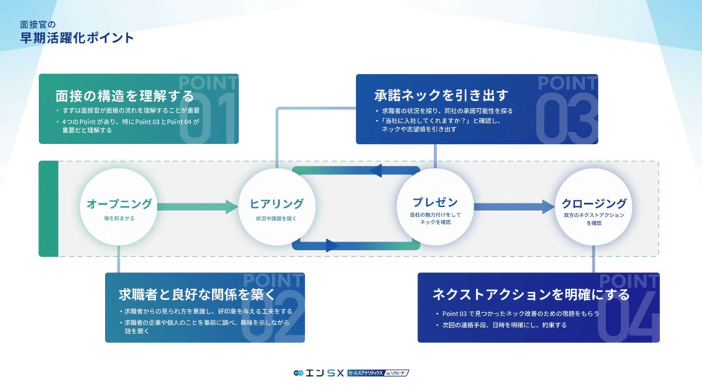 加納氏「営業の構造は『オープニング』『ヒアリング』『プレゼン』『クロージング』の4段階で成り立っています。面接って、実は案件を受注する商談と構造がほとんど変わらない。最初に目的を共有して場を和ませ、相手のニーズを深く掘り下げ、自社の魅力をプレゼンし、最後に意向を確認する。この流れをきちんと踏めば、決定率は確実に上がります」