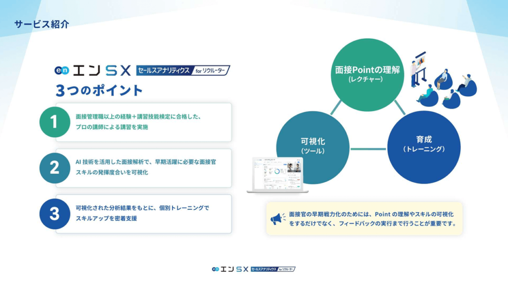 こうした背景を受け、エンSXは2023年よりセールスイネーブルメントツール「エンSX セールスアナリティクス」を基盤に、キャリアアドバイザー育成や人事職向けの面接スキルアップに特化した「セールスアナリティクス for リクルーター(以下:for リクルーター)」の展開を始めた。