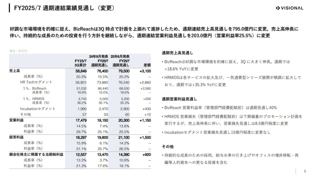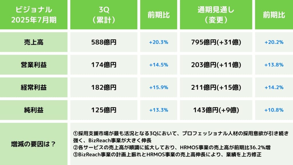 ビジョナルの今期決算では、採用支援市場が最も活発となる3Qにおいて、プロフェッショナル人材の採用意欲が引き続き強く、BizReach事業が大きく伸長しました。HRMOS事業の各サービス売上高も順調に拡大し、売上高は前期比36.2%増。両事業の好調を受け、業績予想が上方修正されました。