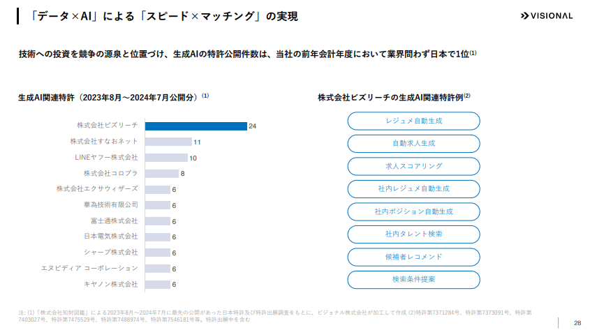 ビジョナルは「データ×AI」による「スピード×マッチング」の実現を目指しており、前年会計年度における生成AIの特許公開件数は業界問わず日本で1位となりました。