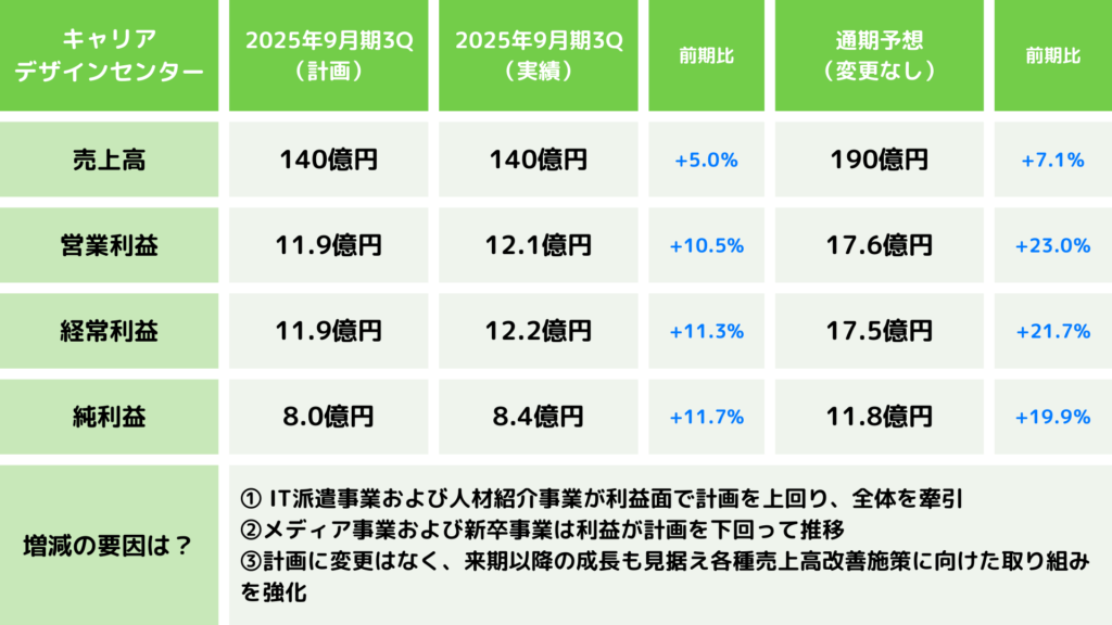 キャリアデザインセンターの2025年9月期第3四半期決算では、売上高140億円(前年同期比5.0%増)、経常利益12.2億円(同11.3%増)と着実な成長を維持しました。特に、IT派遣事業が63.4億円(前年同期比15.1%増)と大幅な成長を記録し、全体業績を牽引しています。