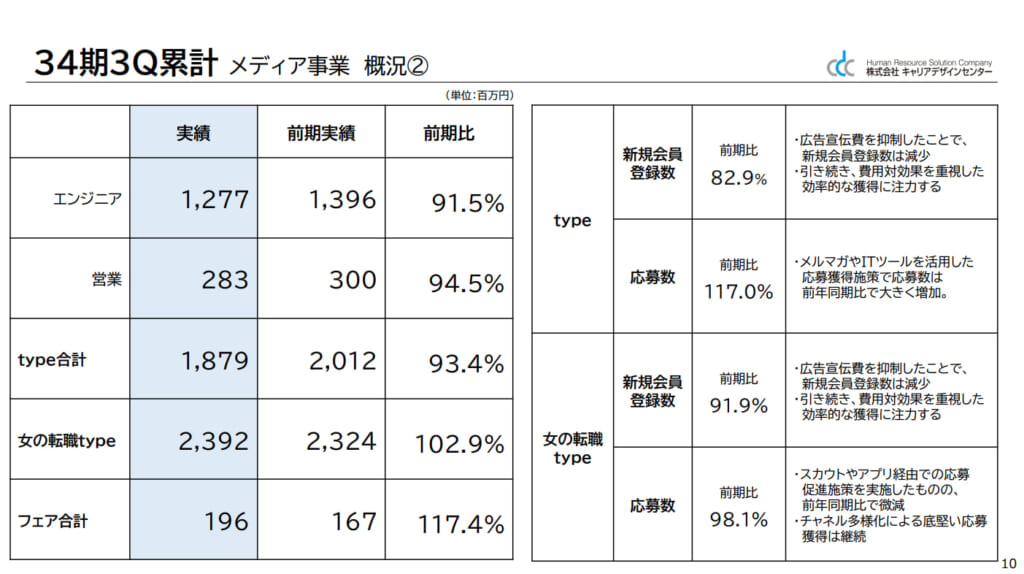 Web求人広告「type」「女の転職type」などを展開する事業です。今期は同業他社の低価格販売が想定より長引き、計画を下回る結果となりました(決算説明資料,p.9)。