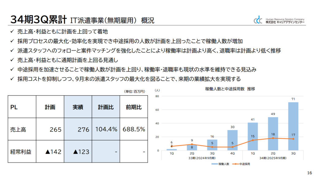 同社が注力施策として打ち出している無期雇用のIT派遣事業も右肩上がりの成長を続けています。今後は9月末の派遣スタッフの最大化を図ることで、業績拡大の実現を目指すとのことです。