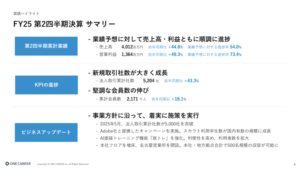 ワンキャリアは第2四半期に過去最高の四半期営業利益を達成し、法人取引社数や会員数の拡大などで事業基盤をさらに強化しました。有効求人倍率が1.24倍(2025年5月時点)と人材需要が堅調に推移する中、企業の採用DXニーズを的確に捉えたキャリアデータプラットフォームが成長を牽引しています。