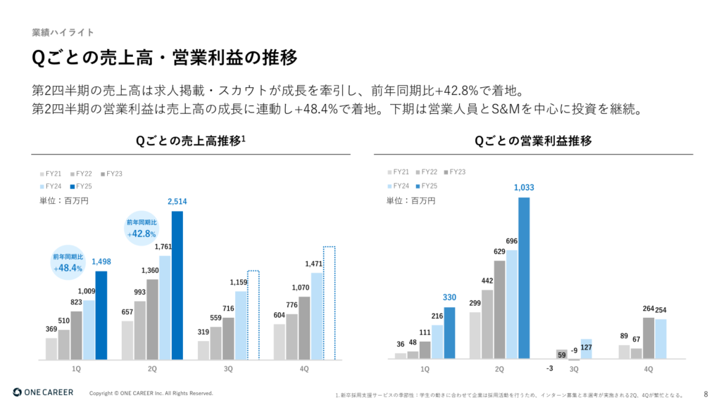 第2四半期の売上高・営業利益は、ともに四半期業績としては過去最高となりました。求人掲載・スカウトが成長を牽引したほか、採用した営業人員の立ち上げが順調に進み、営業力が強化できたことで、順調に進捗しました。下期は、人員の拡大および営業・マーケティング活動を中心に投資を継続してまいります。