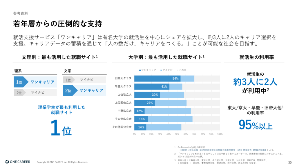 HR総研による「26卒の理系学生が最も活用した就職サイト」の調査で、ワンキャリアが初めて1位となりました(文系は2位)。また、有名大学を中心に就活生のシェアも拡大しており、約3人に2人の就活生がワンキャリアを利用しています。