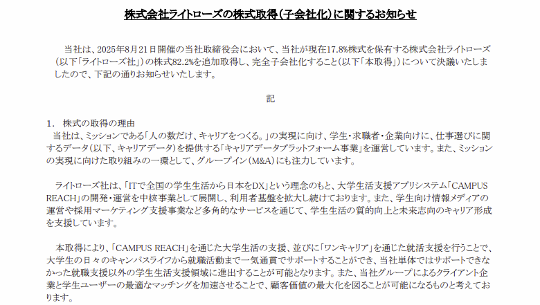 そして2025年8月21日には、大学生活支援アプリ「CAMPUS REACH」を運営する株式会社ライトローズの株式82.2%を追加取得し、完全子会社化することを決議しました。 この取得により、ワンキャリアは学生の大学生活から就職活動まで一貫したサポートが可能となり、クライアント企業と学生ユーザーの最適なマッチングを加速させることを目指します。