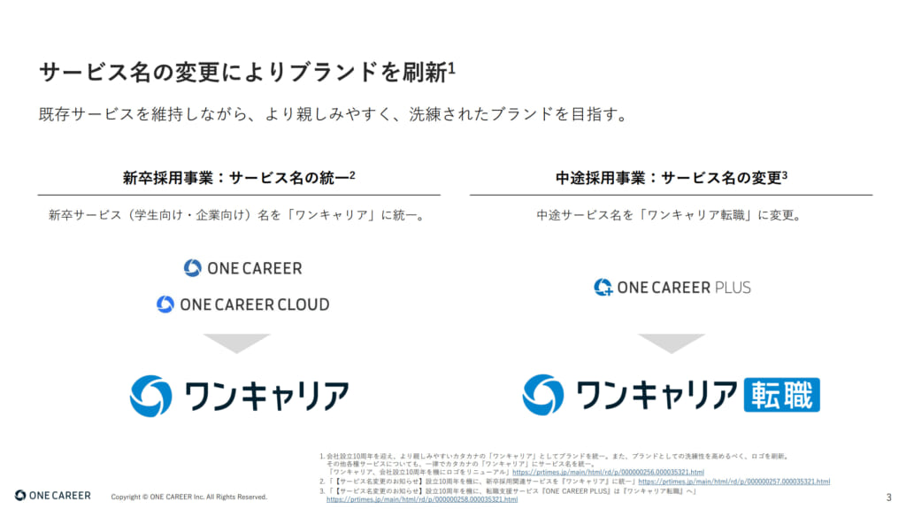 また10周年を迎え、より親しみやすいカタカナの「ワンキャリア」としてブランドを統一。新卒向けサービス名は「ワンキャリア」、中途向けサービスは「ワンキャリア転職」となります。