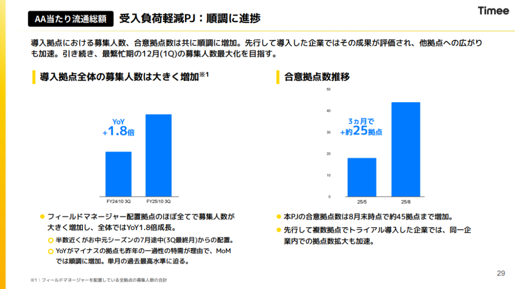 ワーカーの受入負担を軽減させるために、フィールドマネージャーをクライアントの現場に配置。本PJの導入拠点全体の募集人数はFY25/10 3QでYoY1.8倍に。導入合意拠点数も3か月で25拠点増加。プロダクト開発やM&Aも活用し本PJの更なる推進を目指します。