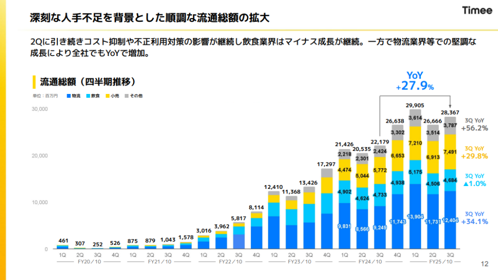 飲食業界ではマイナス成長となったものの、深刻な人手不足を背景に物流業界を中心にアクティブアカウント数が引き続き堅調に増加し、第3四半期単体での流通総額は前年同期比+27.9%の283億円に拡大しました。