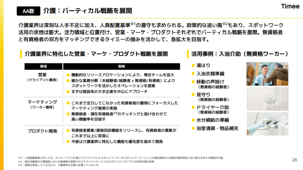 介護業界を注力領域と位置付け、営業・マーケ・プロダクトそれぞれでバーティカル戦略を展開。強みである業務分解(無資格者への業務の切り出し)を活かして、無資格者と有資格者双方をマッチングし、急拡大を目指します。