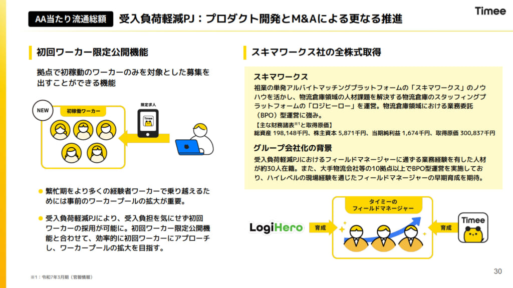 また、物流倉庫領域におけるBPO型運営に強みを持つスキマワークス社の全株式を取得。同社には受入負荷経験PJで長期派遣されるフィールドマネージャーにマッチする人材が約30名在籍しており、M&Aにより今後さらに導入拠点数が拡大していくことが予想されます。