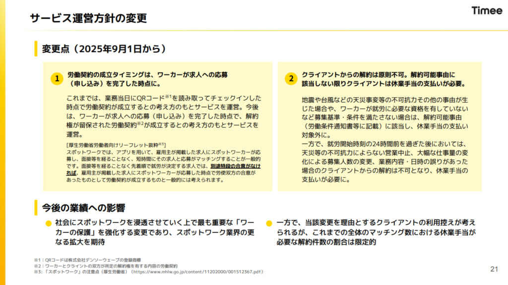 2025年7月4日、厚生労働省はホームページにてスポットワークにおける留意事項をまとめたリーフレットを公表。タイミーもその方針に則り、2025年9月1日から労働契約の成立タイミングを業務当日ではなく求人への応募を完了した時点としました。