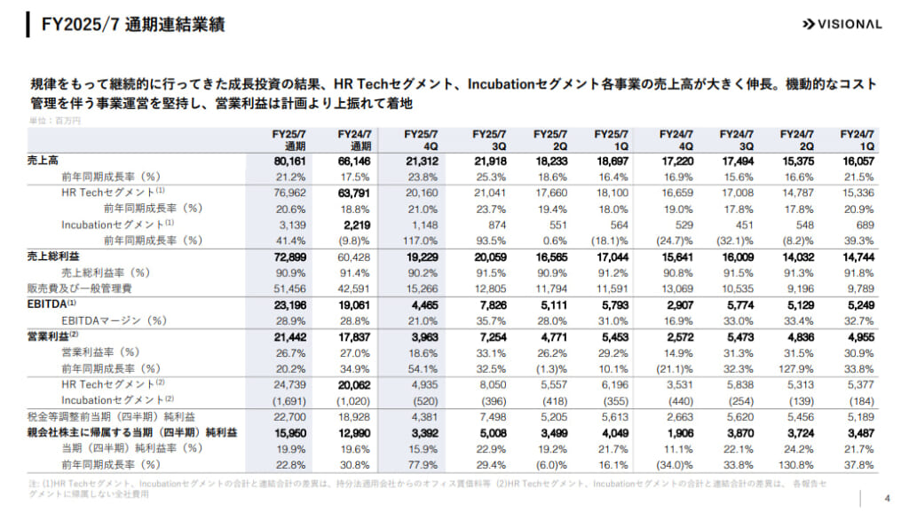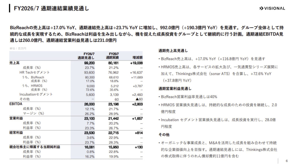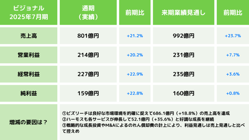 ビジョナルの2025年7月期決算は、主力のBizReach事業が市場の好調な採用ニーズを的確に捉え、売上高・利益ともに2桁成長を実現しました。HRMOS事業も各サービスが順調に拡大し、ARRが前年同期比34.4%増の37.3億円に達するなど、着実な成長を遂げています。