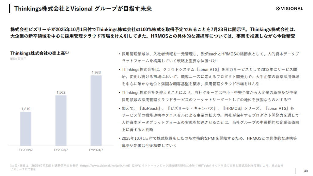 ビズリーチは2025年7月23日、大企業の新卒領域を中心に採用管理クラウド市場をけん引してきたThinkings株式会社の株式を取得する予定だと発表。10月1日付で取得を完了しました。