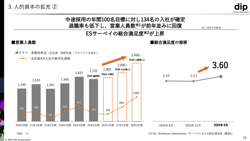 ディップは、営業体制の刷新とスポットワーク領域への投資を軸に、事業基盤の強化を進めています。ソリューション営業体制への移行に伴う一時的な契約社数の減少はありましたが、営業人員の回復や行動量の改善により、今後の持ち直しが期待されます。