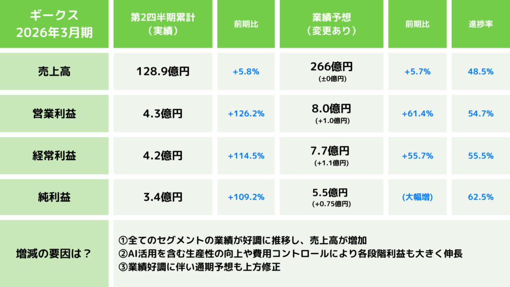 全てのセグメントが好調なことから、ギークスは2025年10月27日に2026年3月期の連結業績予想を上方修正しました。修正後は売上高266億円(前期比5.7%増)、営業利益8億円(同61.4%増)、経常利益7.7億円(同55.7%増)、純利益5.5億円を計画しています。
