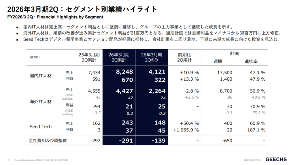 主力事業の国内IT人材は引き続き堅調に推移しています。また、2Qでは海外IT人材の業績が改善し、通期の営業利益計画を期初比プラス60百万円に上方修正しました。また、Seed Techもデジタル留学やオフショア開発が好調に伸びており、全体として良い流れとなりました。