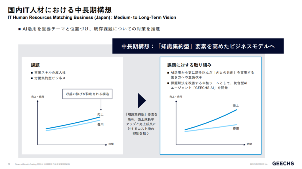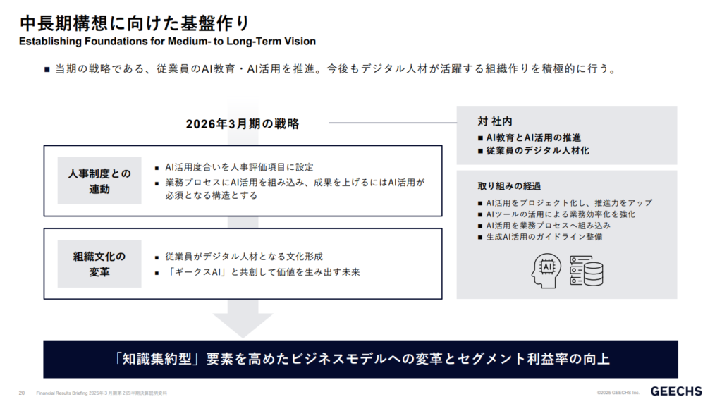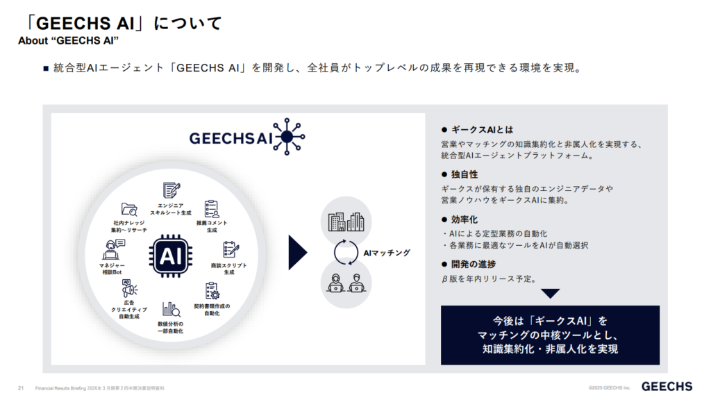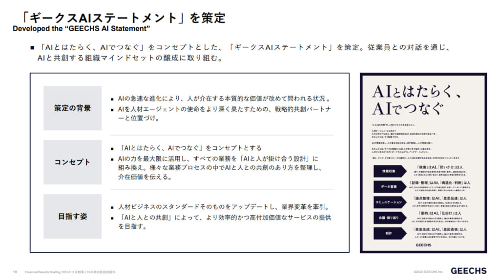 また「ギークスAIステートメント」の策定と統合型AIエージェント「GEECHS AI」の開発により、人材ビジネスの労働集約型から知識集約型への転換を推進。AI活用を人事評価に組み込むなど、組織文化の変革にも着手しています。