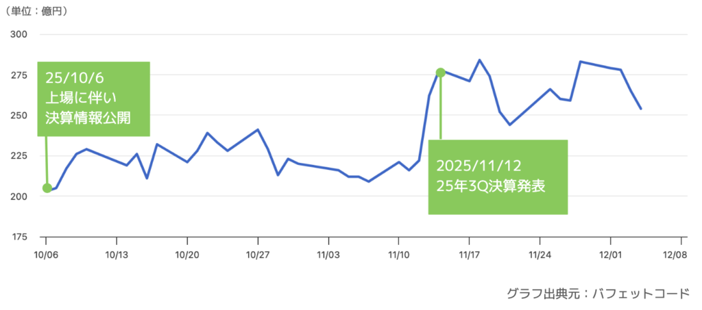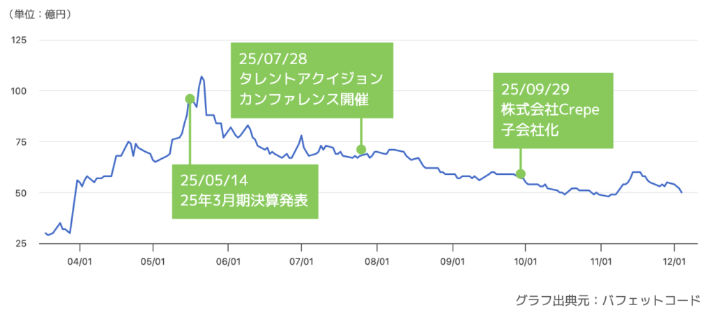 11月に発表された25年12月3Qの決算発表によると、累計売上高28.3億円(YoY+68.8%)、営業利益14.3億円(YoY+155.6%)と大きく伸長、それを受けて株価はさらに上昇しました。キャリアアドバイザーの新規採用・早期戦力化に取り組んだ結果、採用支援数が順調に増加したことが、今回の売上増加に寄与しているようです。
