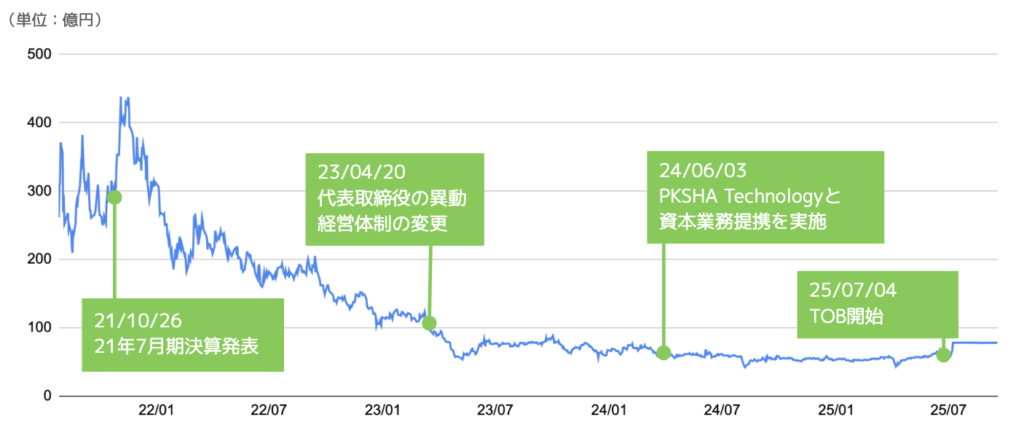 2025年にAIソリューションを提供する株式会社PKSHA Technologyが、同社の株式等を公開買付け(TOB)により取得し、完全子会社化。9月19日に上場廃止となりました。
