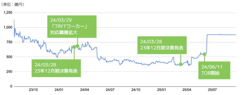 その初年度となる23年決算では、既存・新規事業ともに好調で、売上高約528億円(YoY+19%)、純利益約4.9億円(YoY+22%)と二桁成長を達成。株価も右肩上がりに推移しました。しかし翌24年決算では、求職者獲得がボトルネックとなった結果、既存事業が伸び悩むことに。売上高約571億円(YoY+8%)、純利益約2.9億円(YoY-40%)と、前年比減益となりました。