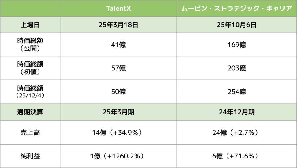 上場時の時価総額規模で見ると、ムービン・ストラテジック・キャリアが初値ベースで約203億円、TalentXが約57億円の値をつけました。