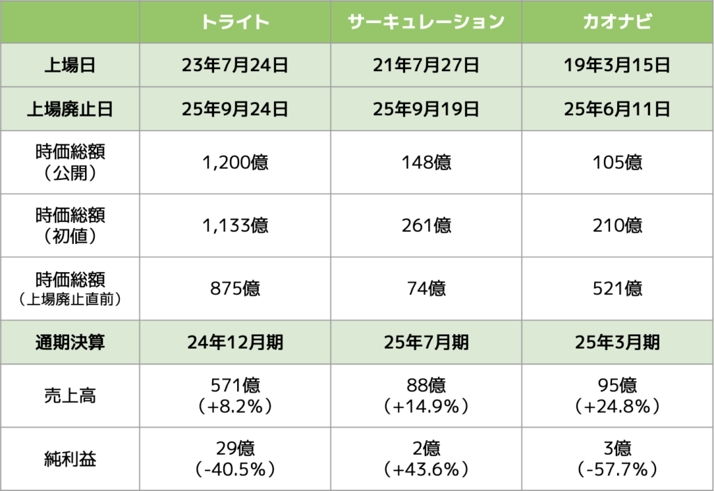 上場廃止直前の決算を見ると、3社とも増収を達成するも、トライトとカオナビは大きく減益する結果となりました。