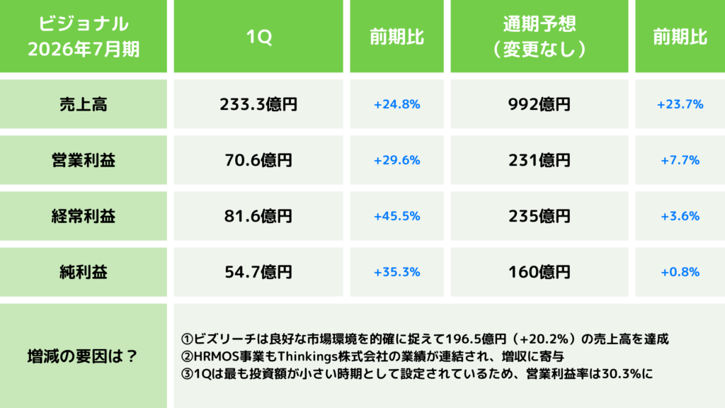 ビジョナル株式会社の2026年7月期第1四半期決算が2025年12月11日に発表されました。この記事ではその決算・IRの内容をわかりやすくまとめて分析・解説し、人材業界の最新トレンドに迫ります。ぜひチェックしてください!