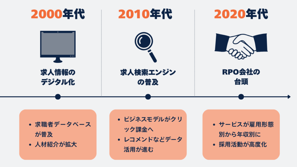 2009年にはビズリーチが高年収層をターゲットとしたスカウト型サービスを開始し、各社からスカウト型サービスが次々生まれ始めます。このような求職者データベースの普及は、同時期に進んだ有料職業紹介事業の規制緩和とも相まって、人材紹介サービスの市場を大きく広げました。