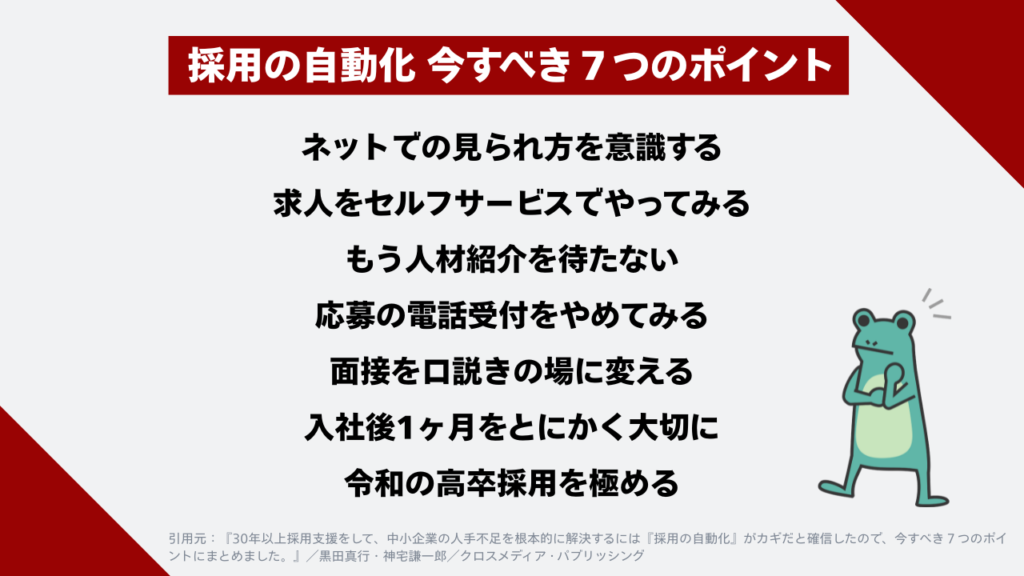 本書は、そんな「採用の自動化」に踏み出せていない地方・中小企業の採用担当者へ向けて、再現性のある採用活動を支える基盤づくりの“はじめの一歩”を解説しています。今回はその中から、2025年度の「今、最低限すべき」ポイントを7つに絞って紹介します。