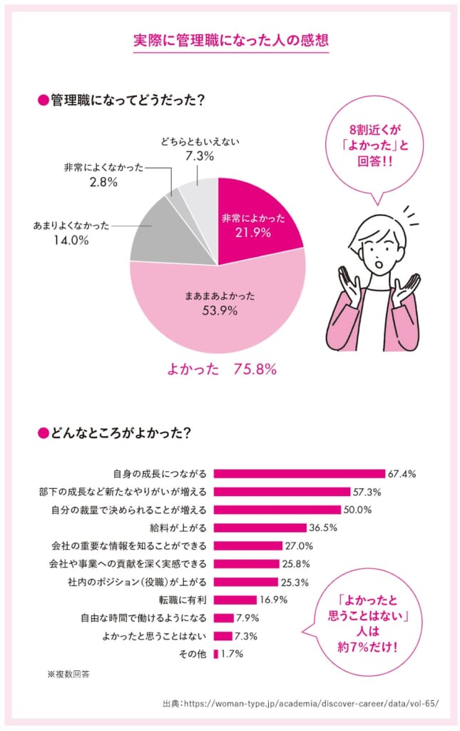 しかし、管理職になった女性のうち、なんと75.8%の方が「管理職になってよかった」と答えています。なる前のイメージと実際の体験には、大きなギャップがあるということです。