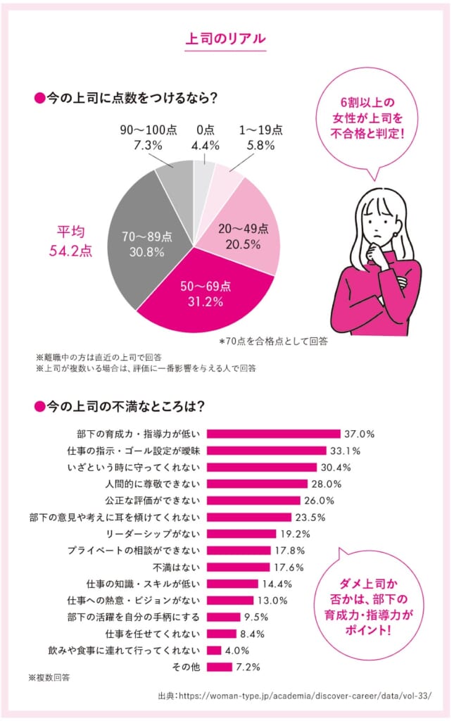 という悩みを抱えているなら、まずは一歩立ち止まって考えてみましょう。「今の上司に点数をつけるなら?」という質問に対する平均点は54.2点。どの職場でも「完璧な上司」はそう多くないという結果が出ています。