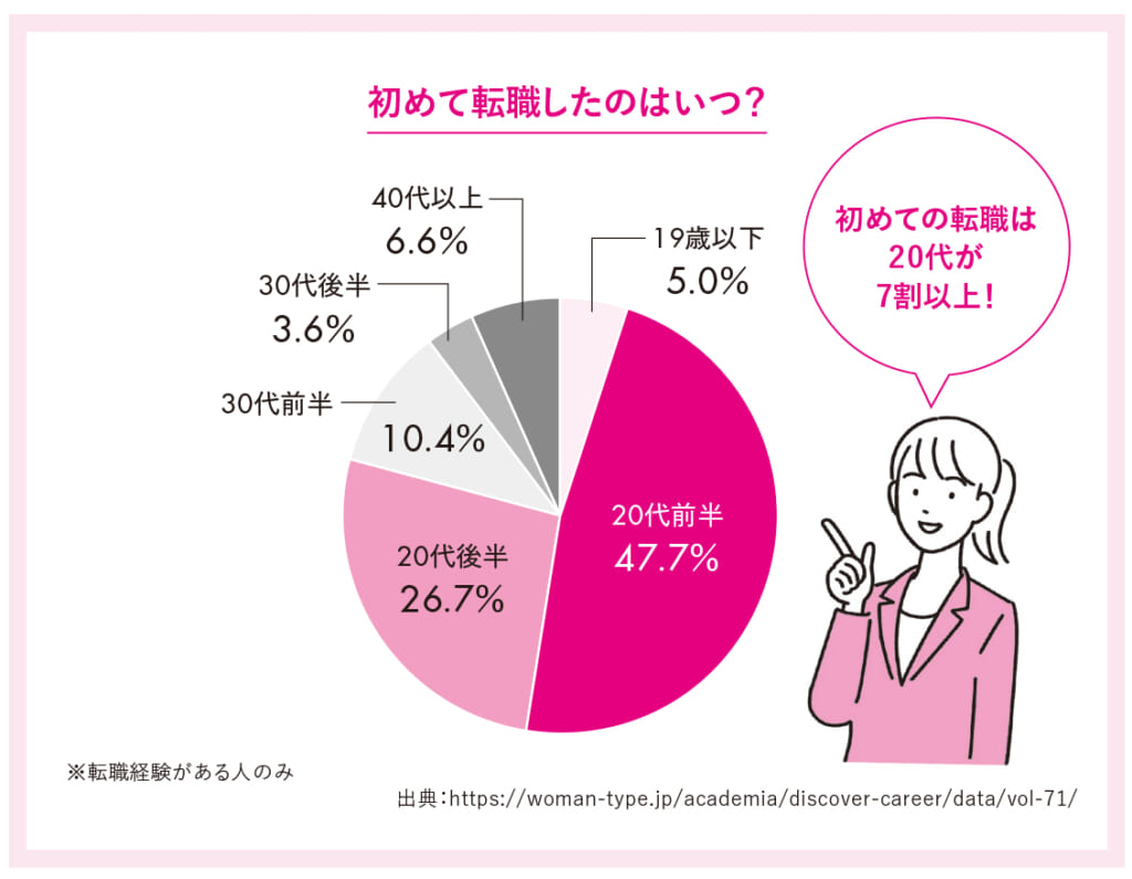 「女の転職type」会員への調査によると、転職経験者の半数以上が「20代前半で初めて転職した」と答えています。
