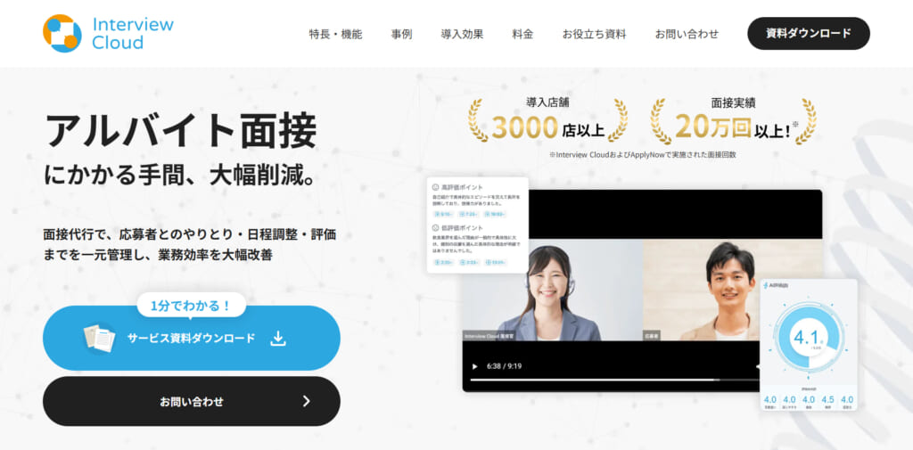 | 特徴 | ・応募受付から日程調整・面接実施までをSaaS+BPOで一括管理できる、アルバイト面接特化のオンライン採用DXプラットフォーム ・面接実施率・採用率の向上が強み、当日キャンセルや未実施を減らして現場・本部双方の負担を軽減 ・多店舗・大量採用に適し、飲食・小売・物流など店舗数が多い企業での導入実績が豊富 |