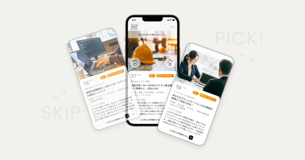 転職エージェントによる応募から面接・内定までの一貫したサポートに加え、求職者の履歴書・職務経歴書、希望条件をもとにAIが最適な求人を提案する。表示された求人は、右にスワイプすれば「応募」、左にスワイプすれば「スキップ」と、スマートフォンで直感的に操作でき、効率的な転職活動を実現できる仕組みとなっている。さらに、応募前後のギャップを抑えるため、求人広告と人材紹介を組み合わせたハイブリッド型の支援により、より精度の高いマッチングを目指していく。