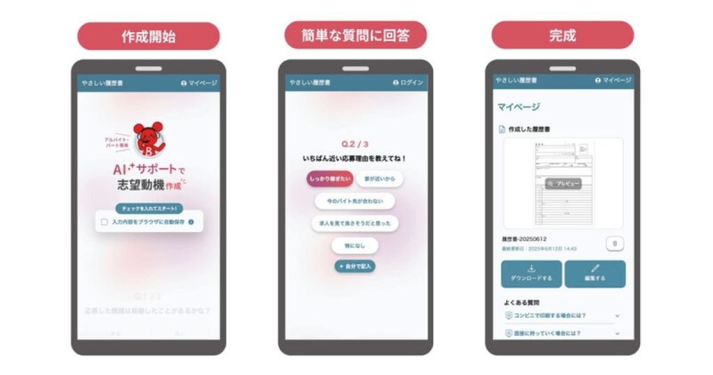 こうした状況を踏まえ、ディップ株式会社はアルバイト・パート求人サイト「バイトル」内において、「やさしい履歴書」機能の提供を開始した。本機能は生成AIを活用し、ユーザーにとって負担の大きい「志望動機欄」の自動生成をサポートするものである。ユーザーはAIとの簡単な会話を通じて、志望動機や本人希望欄といった自由記入欄を、最短5分で作成することが可能となる。