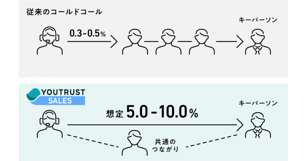「YOUTRUST SALES」は、YOUTRUST上のタレントデータベースを活用し、営業ターゲットへの直接アプローチを可能にするセールステックサービス。営業リソースの限られた現場でも、意思決定者や現場のキーパーソンへピンポイントでコンタクトできるため、商談創出の「質」と「量」の両面で向上が期待できる。