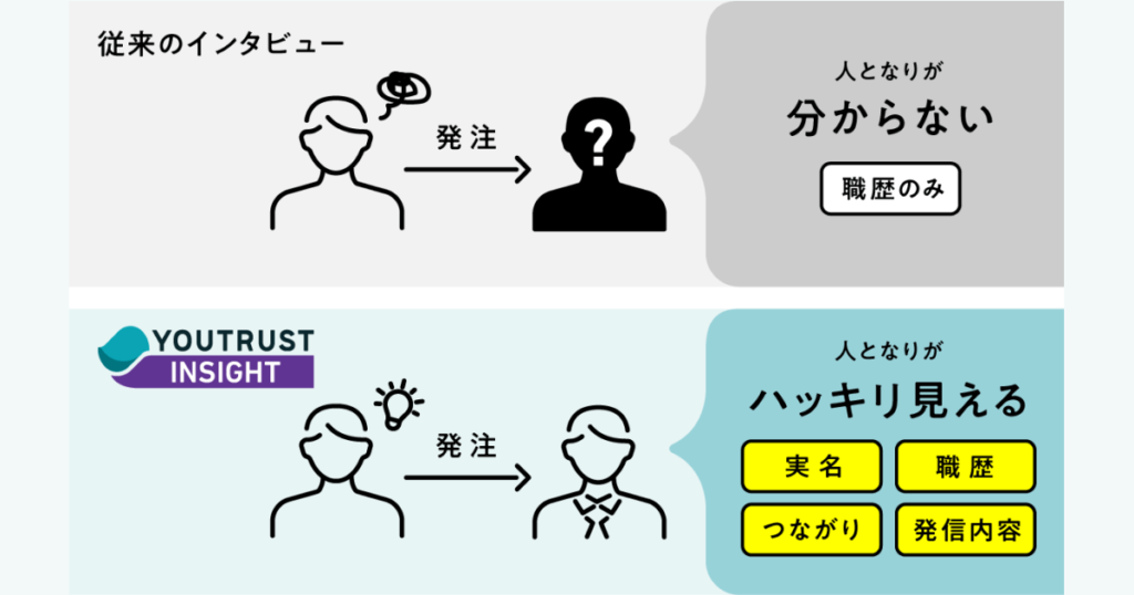 一方「YOUTRUST INSIGHT」は、1次情報を持つ現場のプロとつながり、1時間単位でインタビューを行えるスポットコンサルティングサービス。業界知識や顧客理解、企画・開発の精度向上など、事業成長に向けた多角的な活用が可能だ。