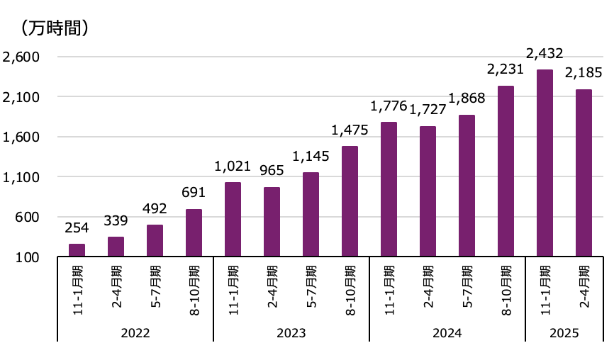 全国・タイミーを利用したスポットワークの総労働時間(実績)