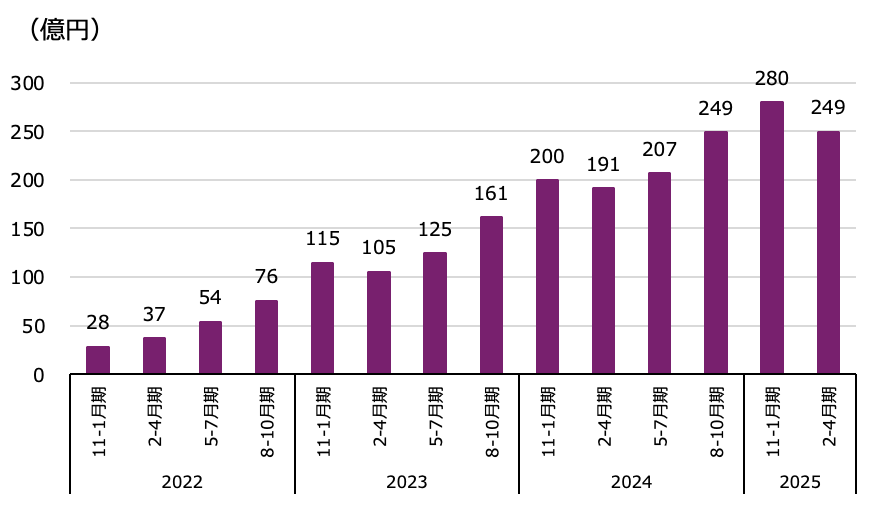2025年2Qの総労働時間は2,185万時間、タイミーを利用したスポットワーク賃金の総額は249億円だった。いずれも前年同期比では増加しているが、求人数と連動して1Q比では減少となった。スポットワーク市場が成熟していく中で、これまでの急速な成長速度はやや落ち着きつつあるようだ。