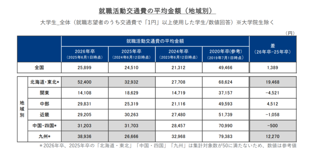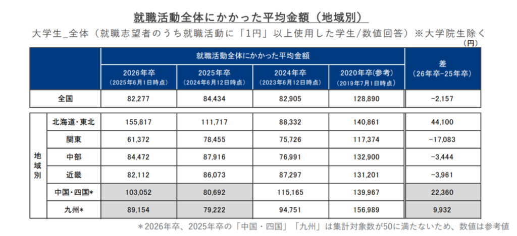 地域別では「北海道・東北」が15万5,817円と最も高く、25卒と比較しても4万4,100円増加した。最も低い「関東」(6万1,372円)とは2倍以上の差があり、地域間の差が見える結果となった。